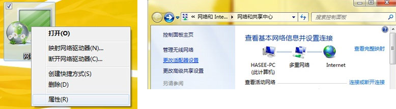 1.右键桌面网络(WIN7)属性。点击更改适配器设置,打开网络连接。
